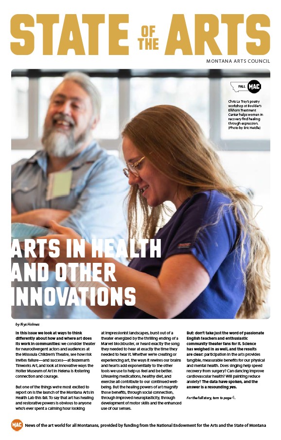 State of the Arts is the Montana Arts Council's quarterly publication which provides arts news, features on Montanans working in the arts, and updates about our grants and programs. Published four times each year, State of the Arts includes a statewide arts calendar of events along with coverage of the visual, literary, and performing arts throughout the state. Each print and digital issues is offered free of charge to all individuals and organizations, and we welcome relevant content submissions for every issue. To suggest content or make a submission, email us at mac@mt.gov.